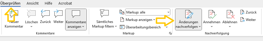 Microsoft Word bietet (nicht nur) Lektor:innen die großartige Möglichkeit, Änderungen in einem Dokument für alle, die daran arbeiten, nachvollziehbar zu machen: mit der simplen wie genialen Funktion „Änderungen nachverfolgen“ – zu finden unter dem Menüpunkt „Überprüfen“.