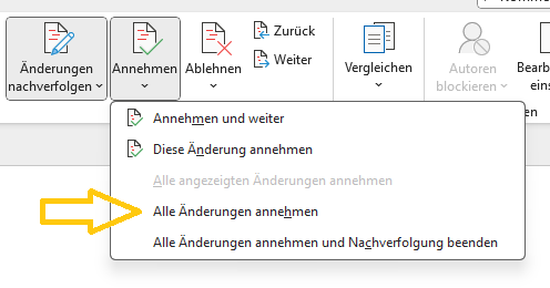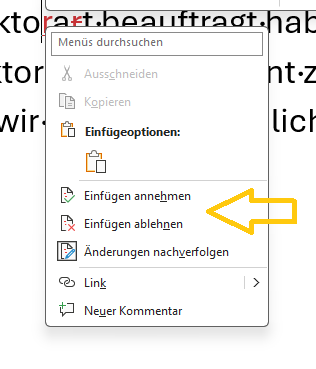 Wenn Sie jede Änderung einzeln durchgehen möchten, bringen Sie den Text zunächst in jene Form, in der der Balken links grau erscheint. Klicken Sie anschließend mit der rechten Maustaste auf den farblich markierten (von uns eingefügten, gestrichenen, geänderten) Text. Es erscheint ein Fenster, in dem Sie auswählen können, ob Sie die Änderung annehmen oder ablehnen möchten. Alternativ können Sie mit den blauen Pfeilen in der Menüleiste von Änderung zu Änderung hüpfen.