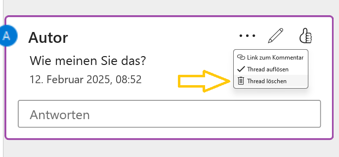 In einem zweiten Schritt (und wenn es nicht bereits vorher im Rahmen Ihrer Überarbeitung passiert ist) kümmern Sie sich um die Kommentarblasen. Wir Lektor:innen merken dann etwas in Kommentaren an, wenn wir einem Gedanken nicht folgen können, etwas unschlüssig ist, eine Quellenangabe fehlt usw. – also überall dort, wo wir als Außenstehende nicht direkt in den Text eingreifen können. Nun sind Sie gefragt! Gehen Sie einen Kommentar nach dem anderen durch. Wenn wir in den Kommentaren eine Frage stellen, betrachten Sie diese als Anregung, an Ihrem Text zu feilen. Schreiben wir beispielsweise: „Wie ist das gemeint?“, ist das ein Hinweis für Sie, dass der Satz nicht gut verständlich ist. Schreiben Sie den Satz so um, dass der Gedankengang für andere nachvollziehbar wird. Haben Sie einen Kommentar abgehandelt, so können Sie ihn anschließend löschen.
